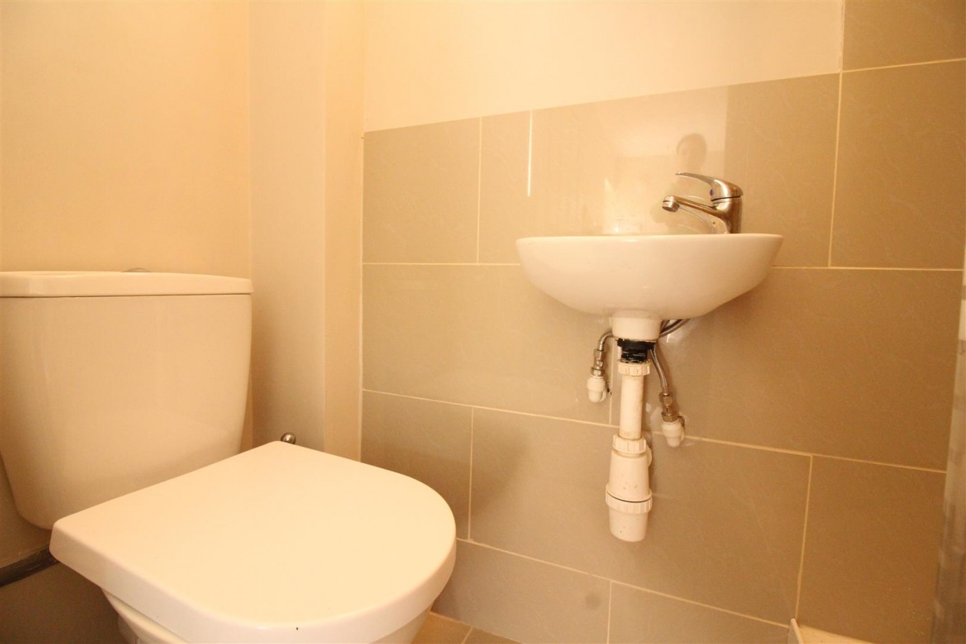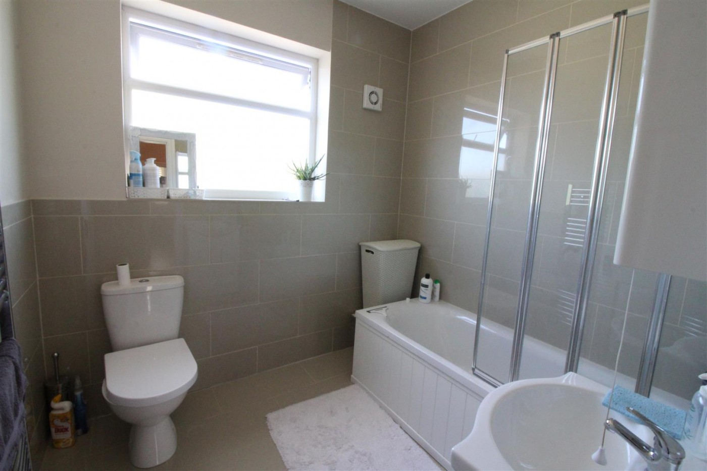 With double glazed frosted window to rear, low level wc, wall mounted wash hand basin, panel enclosed bath with shower, heated towel rail, tiled floor.
