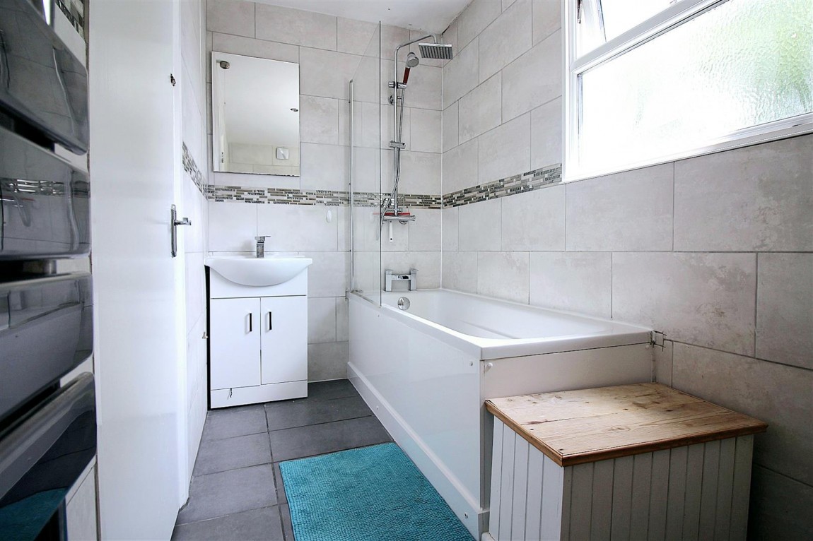 Double glazed opaque window to rear aspect, tiled walls and flooring, single radiator, panel enclosed bath with mixer tap & thermostatically controlled shower, hand wash basin with mixer tap and vanity under, low level flush w/c.