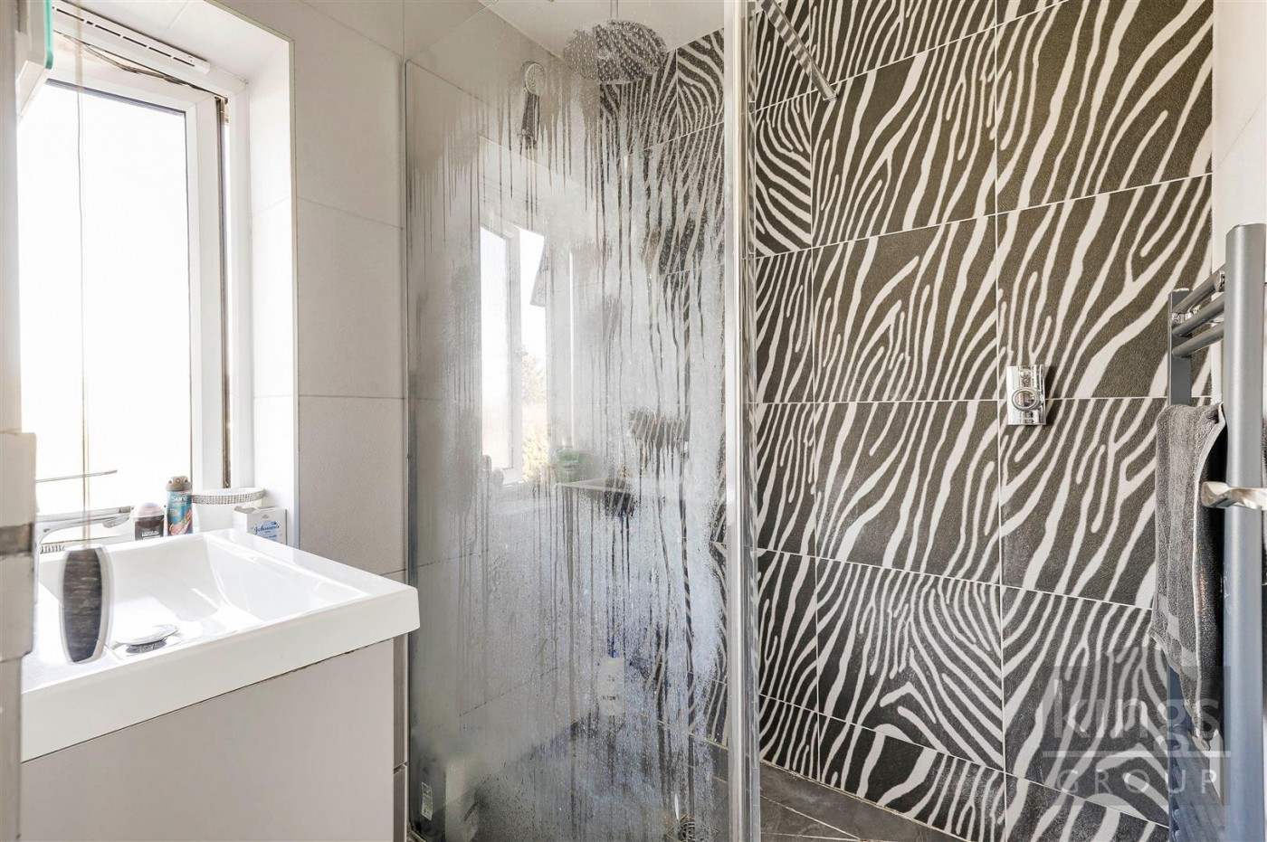 Double galzed windows to rear aspect, ceiling spotlights, tiled walls, heated towel rail, tiled flooring, extractor fan, shower cubicle with thermostatically controlled shower, wash basin with mixer tap and vanity unit under