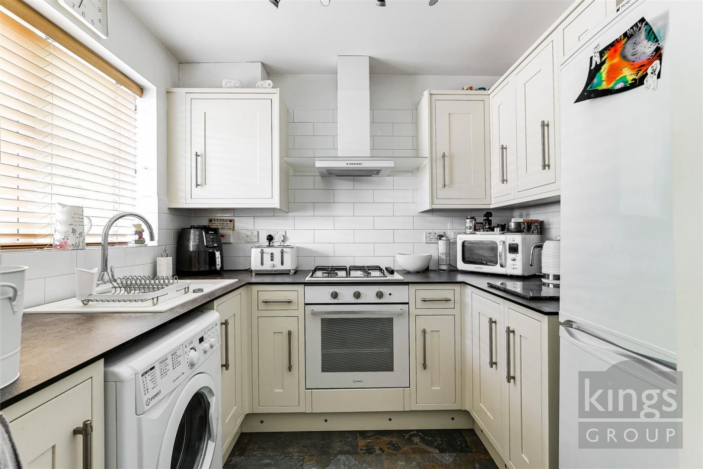 Double glazed windows to the front aspect, tiled flooring, tiled splash backs, a range of wall and base units with flat top work surfaces, electric oven, gas hob, hood extractor fan, double drainer unit, space for fridge freezer, plumbing for washing machine, power points